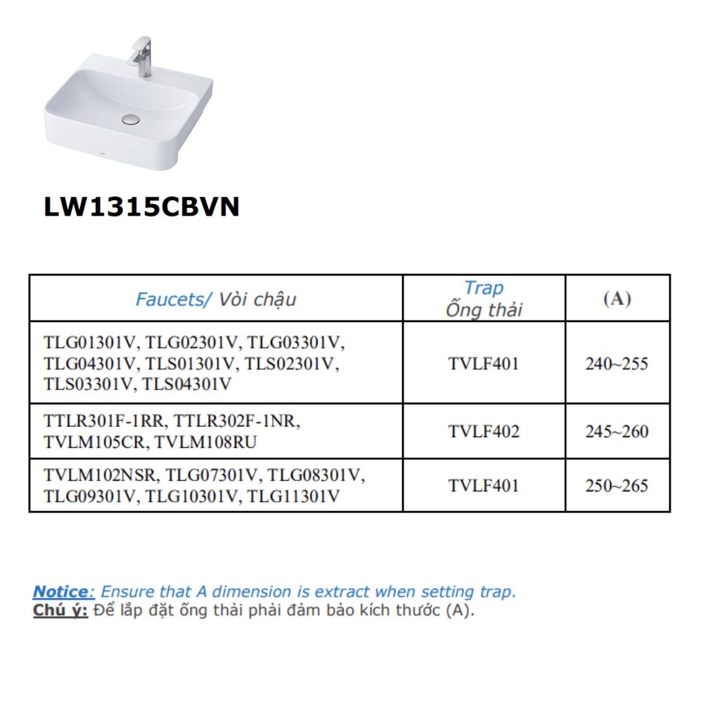 1. Thông số kỹ thuật Chậu Lavabo TOTO LW1315CBVN/XW