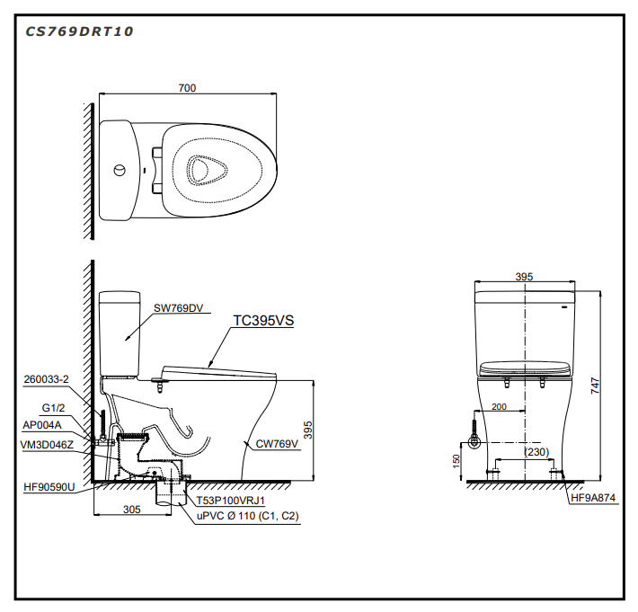 Bản vẽ kỹ thuật bồn cầu TOTO 2 khối CS769DRT8